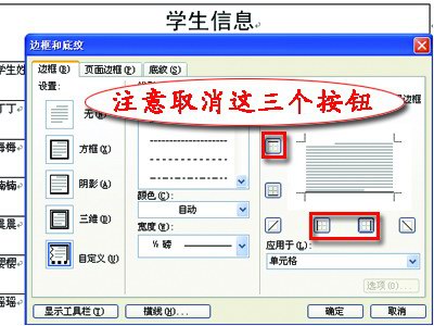 第3-4分钟:“绘制表格”按钮,按原表格线给标题(学生信息)加个框。退出画线状态,右击该行(学生信息)左侧,并选择“边框和底纹”。并依次去掉“预览”栏下的左、上、右侧的实线,以隐藏其表格线,如图3。
