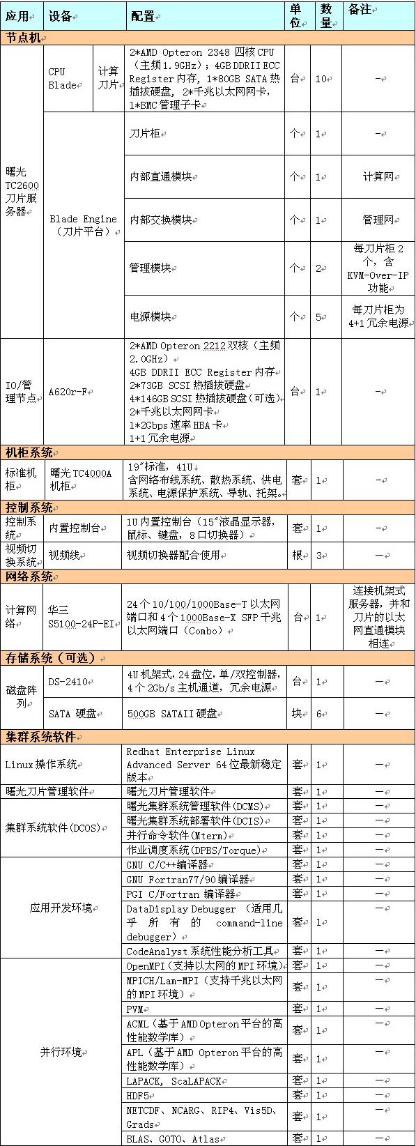 1. 系统配置1-10个CPU Blade节点,最大浮点理论峰值可达608GFlops(约6千亿次),用户可以在少了投资的情况下很好的满足地市级气象部门的预报需求。