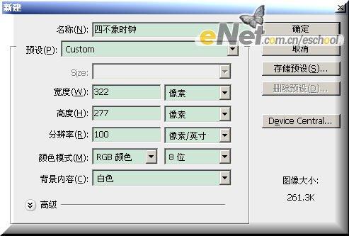 一:新建一个322×277像素、背景色为白色的文件,并将其命名为【卡通时钟】,设置窗口效果如[图1]所示;