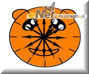 四、现在到了最麻烦的一步了,使用直线工具按住Shift键在小熊脸部画出一条垂直竖线,Ctrl+单击直线图层,得到竖线选区,新建图层,填充黑色,得到竖线图层,复制12条同样的竖线;选择副本1旋转15度,副本2旋转30度,依此类推,设置效果如[图4]把所有线条分布到表盘四周,然后链接所有线条,自由变换调整宽度与小熊脸部大小一至,效果如[图5]所示;