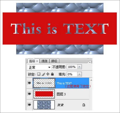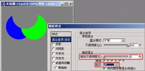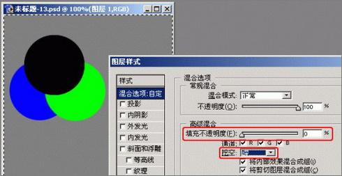 现在我们选择“图层1”,打开层样式对话框,设置“挖空”为“浅”并将“填充不透明度”设置为0,可以得到这样的效果: