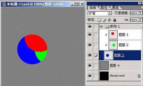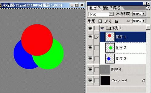 这幅图片由五个层组成,背景层为黑色、背景层上面是图层4(灰色)、再上面是图层1、2、3(颜色分别是红、绿和蓝),最上面的三个层组成了一个层组。