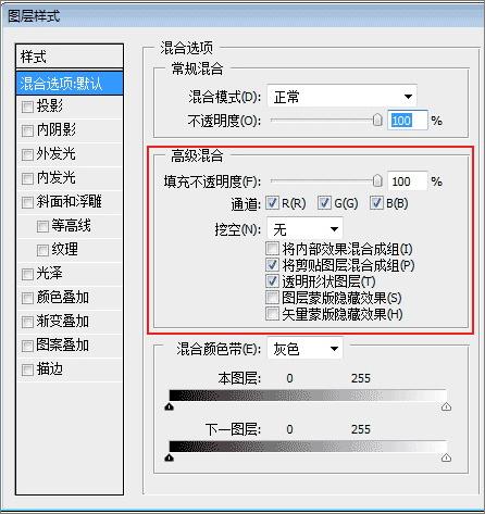 如果我们将图层1的高级混合选项从默认改为如下,那么图层2 就不会被[渐变叠加]盖掉了。