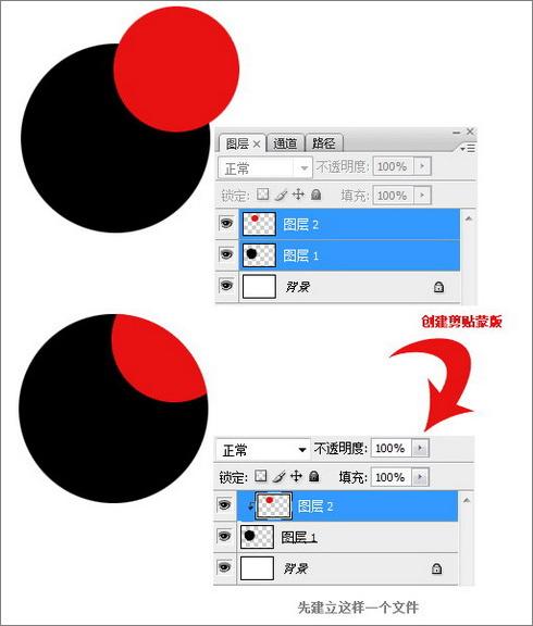 为了演示这个效果,我们首先在上面的那个例子中将图层1和图层2转换成图层3的剪切图层(方法是按住Alt键单击图层之间的横线),如下图:
