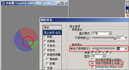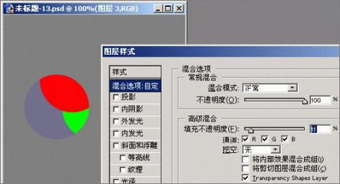 接下来双击图层3打开其层样式对话框,选中“混合 剪切图层”选项,然后减小”填充不透明度“,可以得到这样的效果(注意其中的红色区域和绿色区域分别是图层1和图层2的内容,它们也受到了影响):