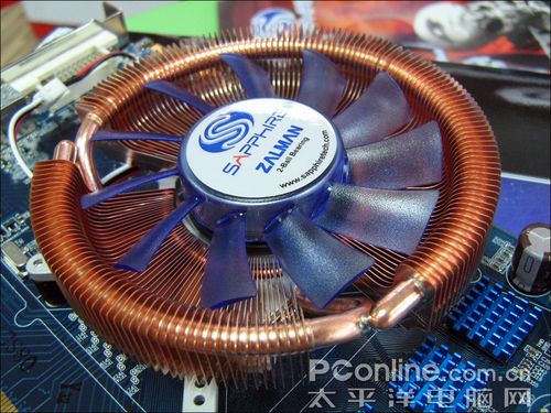 蓝宝石 HD3870 Toxic毒药2代表面覆盖的是特色的Zalman VF900散热器,环形导管上覆盖的是细密的铜质散热鳍片,搭配大口径的散热风扇,完全满足核心的散热需要,同时也兼顾到周边元件的整体散热效能。