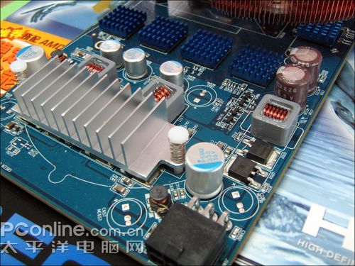 蓝宝石 HD3870 Toxic毒药2代显卡采用了一体式的供电设计,供电元件基本集中在PCB尾部,用料基本选用的是优质的固态电容,辅以全封闭式电感,保证了显卡的稳定运行。