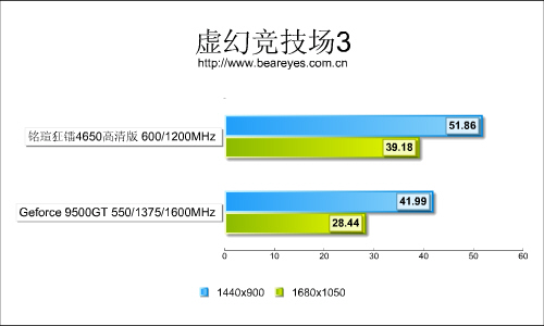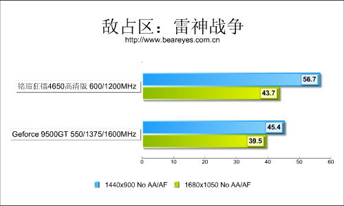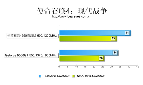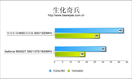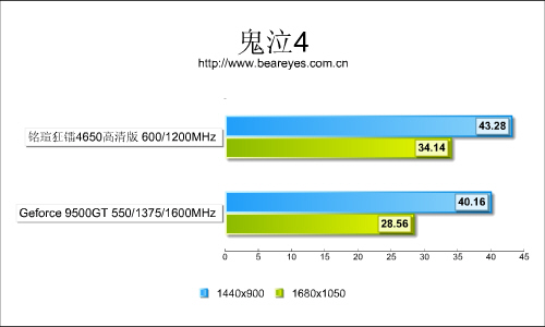 考虑到HD 4650的定位,在鬼泣4中没有开启AA来压榨HD 4650,1440x900分辨率下两者相差不多,但开到1680x1050分辨率,9500GT跌到了30fps以下。