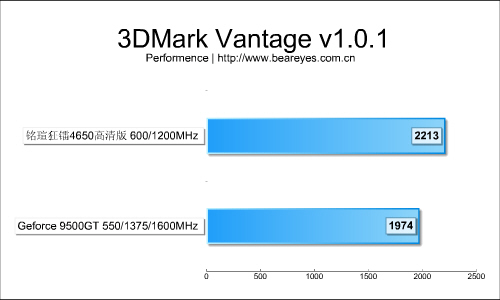 性能级的分辨率和画质为1280x1024,No AA/AF,HD 4650 256MB(600/1200MHz)可以达到P2213,9500GT不到2K分。