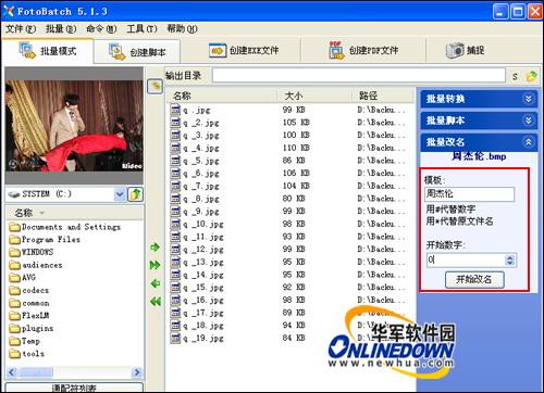 此时图片的格式已经转换完成了,文件名称也被全部改了,这样就达到了快速批量转换图片,更改文件名了。如果只要更改文件名称,不改变图片格式,还有一个更为简单的方法,点击“批量更名”,在模板下面输入文件名称,然后选择开始数字,最生单击“开始改名”按钮即可。如图7所示。