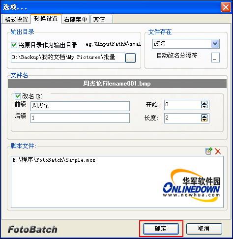 图片添加好以后,点击界面右侧批量转换下面的“设置”按钮,在弹出的选项窗口中设置输出目录,文件名等。如图4所示。