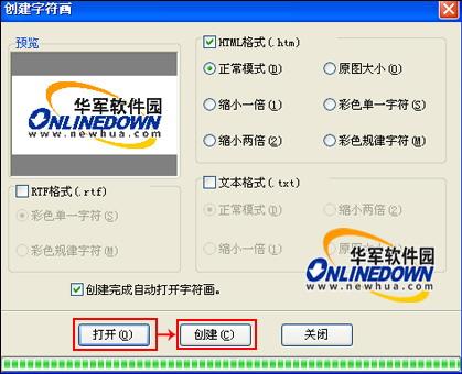 点击“工具”菜单选择“创建EXE字符画”,弹出创建字符画对话框,在此对话框内点击“打开”按钮,打开你想要创建的字符画图片。最后点击“创建”按钮,然后保存要生成的文件,即可创建相应的文件。如图16所示。