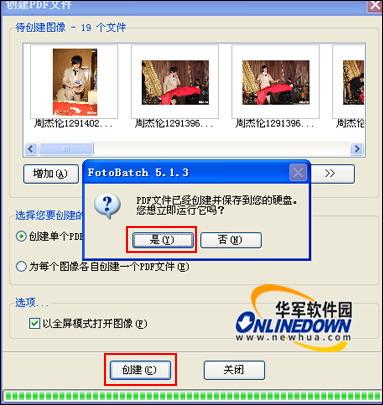 然后进行创建选项设置;以全屏模式打开图像,打开创建后的PDF文件,将自动以全屏模式显示图像。最后点击“创建”按钮,保存PDF文件名,点击“保存”按钮即可创建一个PDF文件。如图14所示。