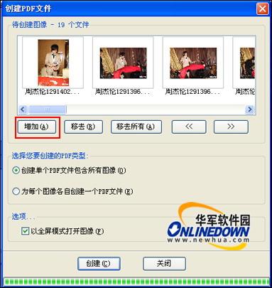 点击工具菜单上的“创建PDF文件”按钮,会自动弹出创建PDF文件对话框,点击“增加”按钮选择要创建的图像文件。如图13所示。