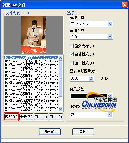 点击工具菜单“创建EXE文件”按钮,会自动弹出创建EXE文件对话框,在此对话框中点击“增加”按钮选择要创建的图像文件。如图11所示。