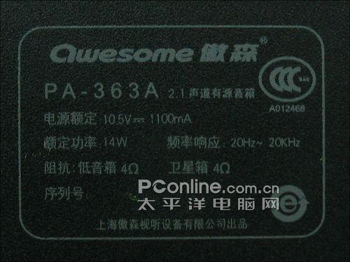 傲森 PA-363A采用2.1构架,低音炮采用木质箱体,卫星音箱则采用塑质材料,低音炮采用了高光处理,给人时尚简洁大方的第一观感,不过卫星箱外观中规中矩,光泽比较欠缺,全套产品都为纯黑色,因此也有“黑豆”之称。这款产品与傲森的一些2.1箱一样,功放设在主卫星箱上,所以可以脱离低音炮成为2.0形式的音箱,方便外出携带。