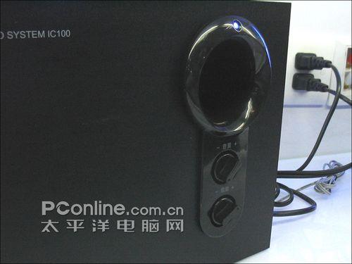 奋达 IC100(08款)属于传统的2.1音箱系列,控制单元和重低音单元设计在一起,前置倒相孔,有音量调节和低音调节两个调音旋钮,全部设置的低音炮前面,这样设计最大的好处就是方便音箱的放置和调节,比起设在侧面和背面明显要人性化许多。