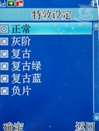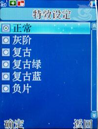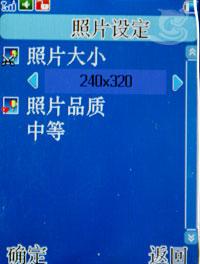该机可以拍摄80X60、240X320、160×120、320X240、640X480五种像素的照片,照片品质分为高中低三等。另外,还有太阳光、钨丝灯、日光灯、阴天、白热光几种白平衡,以及灰阶、复古、复古绿、复古蓝、负片几种特效设置。