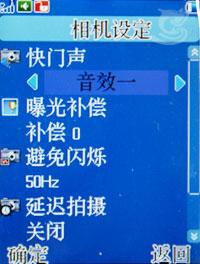 前面我们说过,该机只携带了一枚30万像素的摄像头,虽然摄像头像素不高,但在设置里可以设置快门声、曝光补偿、避免闪烁、延迟拍摄(5秒/10秒/15秒/关闭)、连拍设置(关闭、单张连拍、三连拍、五连拍),并支持夜间模式。