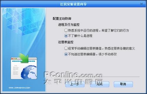 配置主动防御选项时江民2009为初学者(新手)与有经验的用户这两类用户准备的不同的主动防御方案。当用户勾选的是“不了解什么是进程”“不知道注册表编器”选项时,江民2009安装完毕后主动防御功能开启的就只有“未知病毒监控”,这时是没有相关的注册表修改提示选择框出现的。