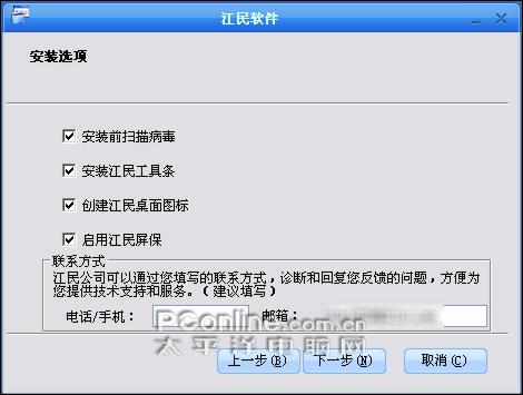 接下来可以选择是否进行安装前扫描病毒(江民2009将在初步判断系统没有被病毒感染后,再开始安装)、安装江民工具条、启用江民屏保等的额外安装选项,用户可以根据自己的要求来选择是否安装。
