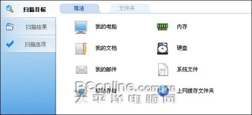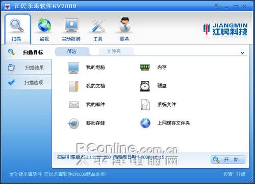 江民2009的快捷扫描选项对比江民2008有了几个变化,去除了“软盘”这个已经淘汰的存储介质选项,并且去除了以及“网上邻居”、“光盘”这两个快捷目标,取而代之的是“系统文件”、“移动存储”及“上网缓存文件夹”。笔者认为新版的快捷目标更能让用户快捷的找到自己需要的扫描目标。