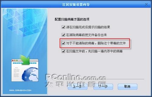 在图5的选项中谨慎选择“对于不能清除的病毒,删除这个带毒的文件”这个选项。如果你勾选了“在扫描文件前,先扫描一遍内存中的病毒”这个选项的话,以后江民2009进行自定义病毒扫描时都会事先扫描内存。当然,安装完毕后你也可以在江民2009的设置选项中修改这一选项。