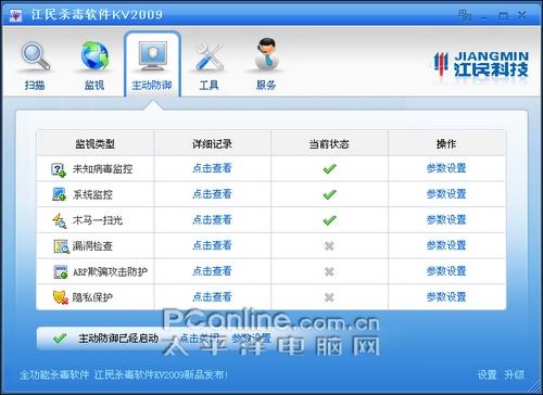 江民2009主动防御增加了未知病毒监控、以及ARP欺骗攻击防护等功能,而这些功能的开启与关闭操作不像“实时监控”选项中那样快捷,如果你想要单独的开启与关闭某一主动防御功能的话,需要进入“参数设置”中才能进行操作,较为不便。主界面上的“点击关闭”或“点击开启”只能批量开启与批量关闭主动防御所有功能。