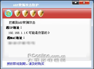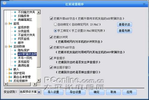 笔者使用在另一台电脑上使用某网络管理软件对装有江民2009的电脑进行伪装网关的arp欺骗攻击,结果被江民2009顺利拦截,江民2009联网正常。在ARP欺骗攻击防护的设置选项中我们可以对IP/MAC地址进行绑定。
