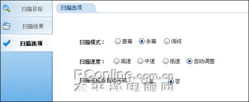 在“扫描选项”中增加了“扫描速度”选项,用户可以根据自己的需求在扫描速度与系统资源占用之间作出相应的调整设置。