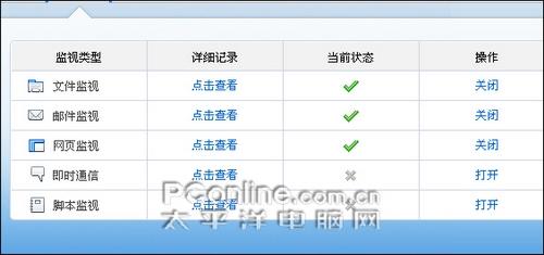 在江民2009中,“监视”选项是以独立的一个选项卡形式出现的,用户可以通过它方便的关闭与开启自己所需要的监控目标。需要注意的是,“即时通讯”和“脚本监视”这两个监控选项是默认没有打开的,建议用户开启这两项监控。