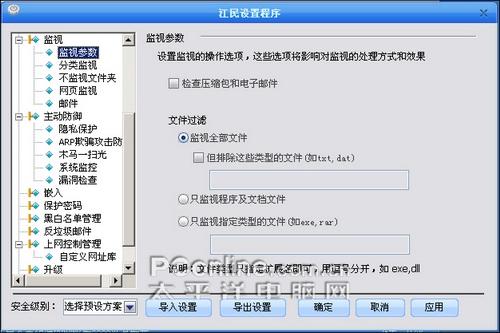 江民2009中有个“安全强度”选项,它为用户设定了低、中、高、自定义的安全强度保护级别。用户可以根据自己的实际情况来设定不同的安全强度,让用户在更强大的防御能力与更好的兼容性之间灵活的切换。