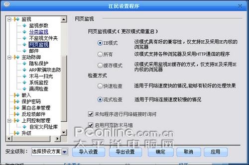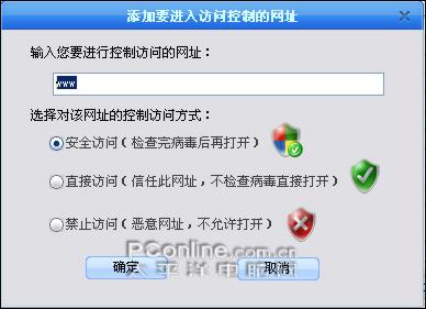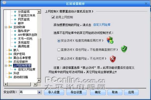 在江民2009中还增加了“上网控制管理”功能,用户可以自行设置访问网站时的扫描形式,也可以禁止访问设定的网址。