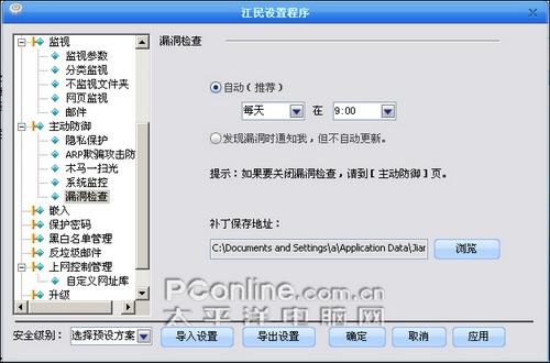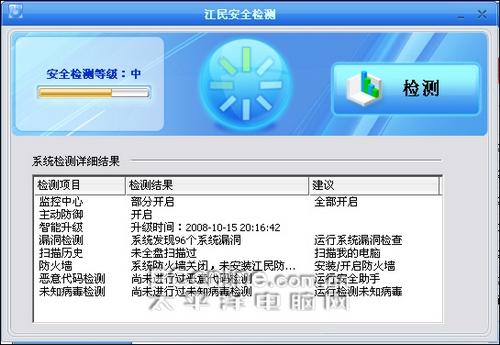 江民2009的系统安全检测工具对杀毒软件实时监控、主动防御、病毒库智能升级、防火墙是否开启安装,以及系统是否进行过漏洞修复、恶意代码和未知病毒扫描情况进行检测,并根据检测结果给出高、中、低三种安全级别,指出系统存在的不安全因素并提出对应的安全建议,方便用户及时掌握和修复系统存在的不安全因素和漏洞。