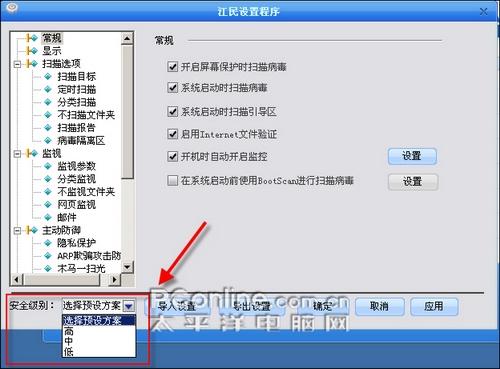 同时在“常规”选项中还有个“安全级别”的选项,江民2009预设了高、中、低三个安全级别,随着用户选择的不同级别,江民2009相应的保护选项也随之改变,这样用户就可以快速的根据自己电脑运行环境的变化而进行不同安全级别的切换了。比如用户在互联网冲浪时可以选择安全级别为高,以便最大程度上防范病毒,而在没有联网也没有安装其它软件及没有启用移动存储设备时的相对安全环境下可以选择安全级别为低,这样可以提高计算机性能。