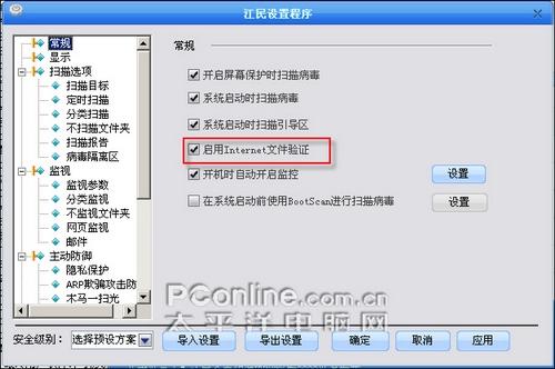 在江民2009的设置程序的“常规”选项中还增加了“启用Internet文件验证”选项:启用该选项后,江民2009将自动联网验证windows 系统文件,以保证系统文件没有被恶意替换,同时防止误杀系统文件,加快扫描速度。
