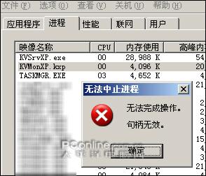 首先用任务管理器对江民2009的相关进程进行结束进程操作。结果:无法结束进程