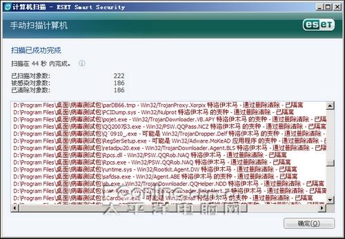 由于各杀毒软件计算文件方式不同,我们以扫描后剩余文件来做对比。而在扫描过程中两个皆使用的是“对发现的病毒进行删除操作而不是清除操作”。结果:ESET Smart Security扫描后剩余文件为 10个,江民2009扫描结果剩余15个。