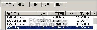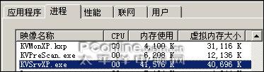笔者重启计算机后让在五分钟内不进行任何操作以保证系统处于相对闲置的状态。而江民2009采用的是默认配置,笔者在Windows任务管理器中对江民2009在空闲时和忙时(扫描病毒时)的资源占用情况进行记录。