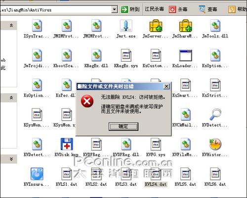 笔者尝试对江民2009安装目录下的文件进行删除、修改操作,以测试江民2009的自我保护能力,结果无法删除与修改相关文件,同时也无法在江民2009安装目录下新建文件。