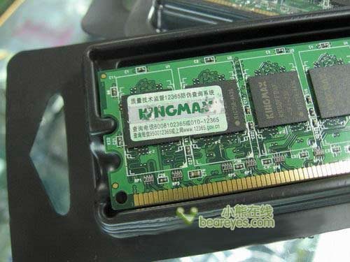 KINGMAX 2GB DDR2-800内存采用带有“KINGMAX”字样的芯片颗粒,FBGA封装方式,内存PCB中央位置焊接了红色“关公防伪芯片”以及SPD芯片,很难仿造,有效杜绝了假货问题。