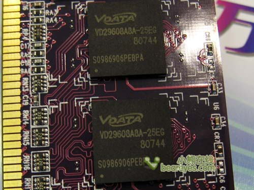威刚万紫千红1GB DDR2 800内存芯片标注了“VDATA”字样,均采用经过威刚检验过的优质芯片,颗粒编号为VD29608A8A-25EG。威刚内存一向做工良好,加上威刚一贯不错的市场口碑以及可靠的售后服务,相信此售价会吸引众多消费者。
