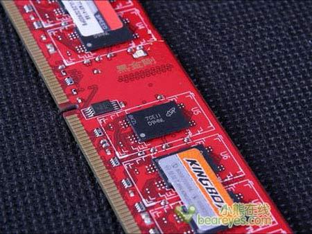 内存采用了墨绿色6层PCB底板,双面16颗64MB内存颗粒设计。使用了KingMax独有的“红心”防伪,让我们可以安心使用而不必为买到假货发愁。内存表面走线规矩,微型帖片电容和高品质电阻充分保证了内存的稳定工作。不过在焊点等方面感觉略显粗糙。
