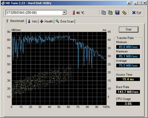 从HD Tune的测试成绩上看,新蓝视点6080的硬盘的传输表现不错,但在测试中出现了较为明显的波动。硬盘的突发数据传输率上,达到了一个比较高的数值,75.5MB/s的平均读取速度,说明了这块硬盘能够在读取的过程中维持高速的读取速度。