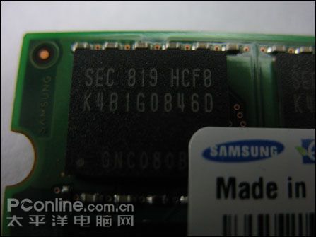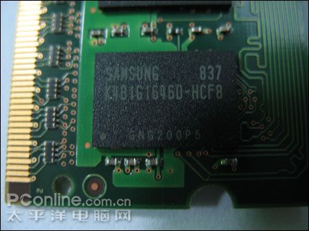 作为业内少数几款已经上市的DDR3 1066 2G笔记本内存,这款三星金条 2G DDRIII 1066/笔记本内存无论是在颗粒的选用上海市整体PCB的做工上都非常细腻。起采用了正反面共16枚颗粒的设计,每一枚颗粒的容量为128M。而整体PCB的做工也达到了比较完美的水平。各种贴片元件的焊接非常整齐和饱满。而新的DDR3内存模组除了具有高速特点之外,起另一大特点就是其工作电压相对于DDR2内存来说,工作电压大幅度降低,为笔记本提高电池续航时间提供了保证。