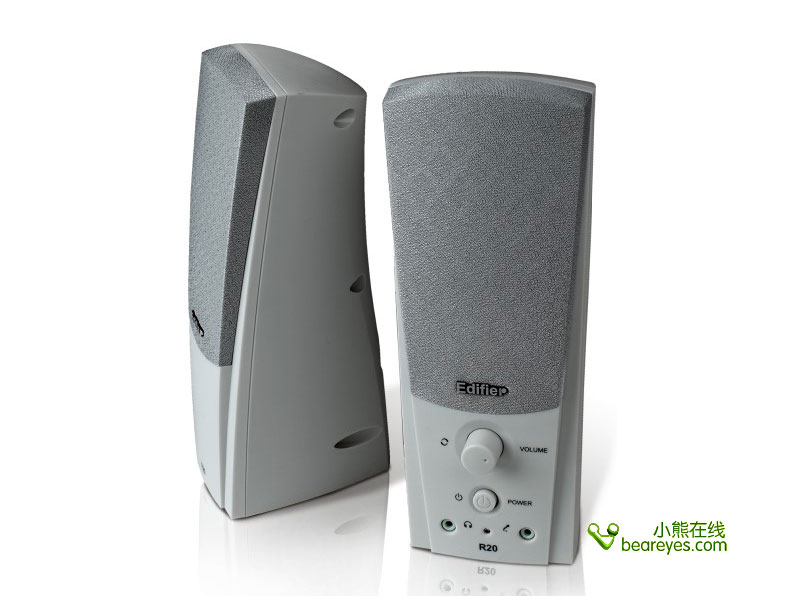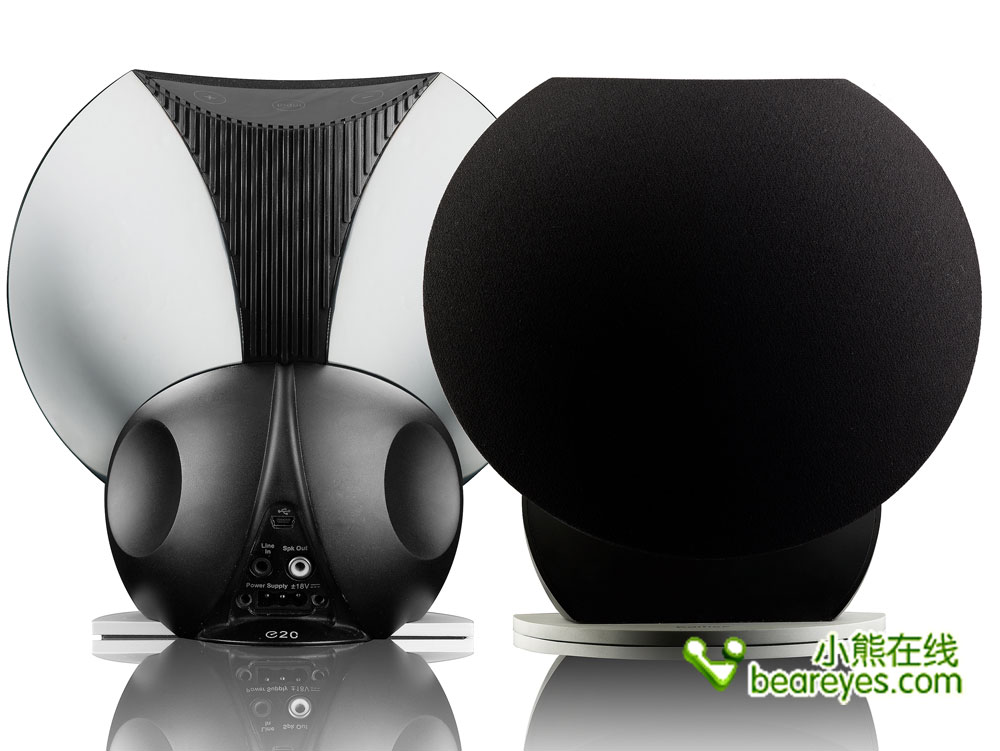 从上面的图片可以看出,E20绝对具有非同一般的外观工艺。而从我们得到的消息来看,深厚、坚实的铸合金底座、高达25W每声道的富足功率储备,这绝对的精品理念立刻将用户对立体声音箱的看法引向另外一个高度。如果从外形来看,E20倒还似乎像是两只可爱的小狗,蹲在桌子上仰望着主人的样子。