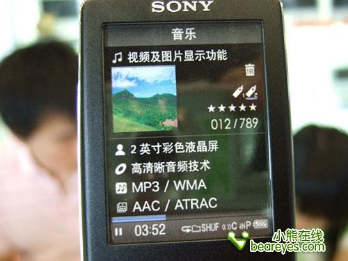 在视频功能方面,SONY A826可支持播放H.264编码AVC格式合MPEG-4格式的视频文件。AVC格式是MP4格式的一种,在清晰度方面更胜一筹,但是这种格式的视频文件所占的空间要比普通MP4格式更大一些。其视频速度达30帧/秒,画面清晰流畅,色彩过度自然,不过由于视频格式需要转换,而且屏幕尺寸略小,因此更多的用户选择这款产品主要是为了音频性能。其还可以支持浏览JPG格式的图片,支持画面旋转、幻灯片模式浏览等功能,便于用户的使用。
