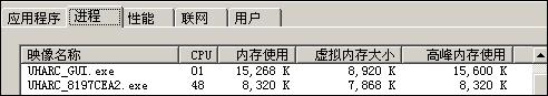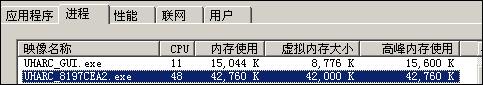 UHARC GUI 压缩时:CPU占用高峰时72%,维持在50-60%之间,高峰内存使用58M,平均内存使用55-58M。