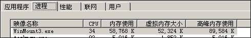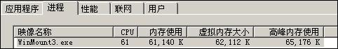 WinMount 压缩时:CPU占用高峰时66%,维持在55-60%之间,高峰内存使用65M,平均内存使用50-60M。