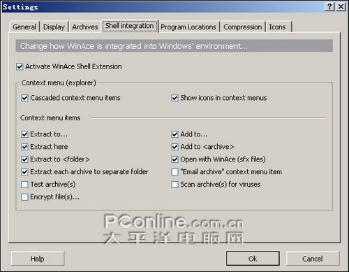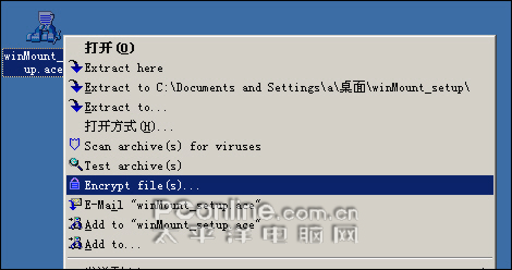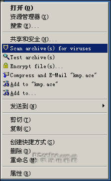 WinAce的右键菜单包含了其它几款压缩软件所没有的病毒扫描选项,用户可以通过它快捷进行压缩包内的文件病毒扫描。还支持加密文件、与测试压缩包操作。快捷解压菜单选项中同样多了扫描病毒、测试压缩包、加密文件的选项。